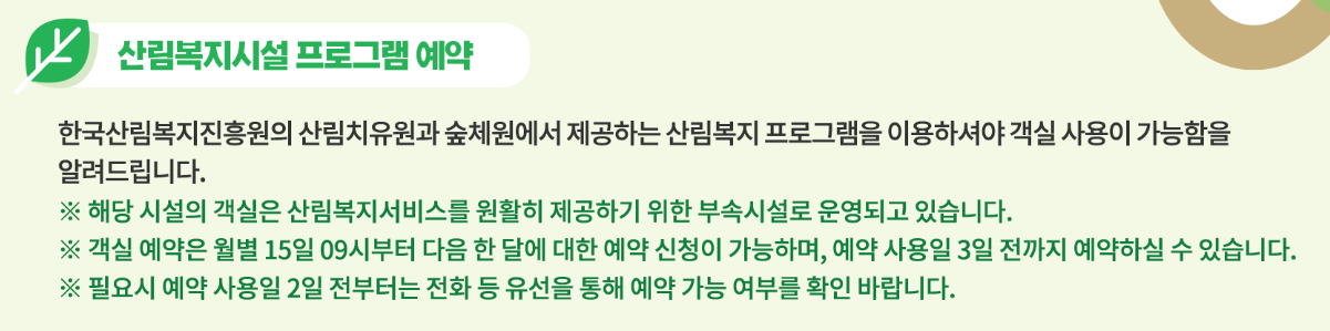 - 한국산림복지진흥원의 산림치유원과 숲체원에서 제공하는 산림복지 프로그램을 이용하셔야 객실 이용이 가능합니다.