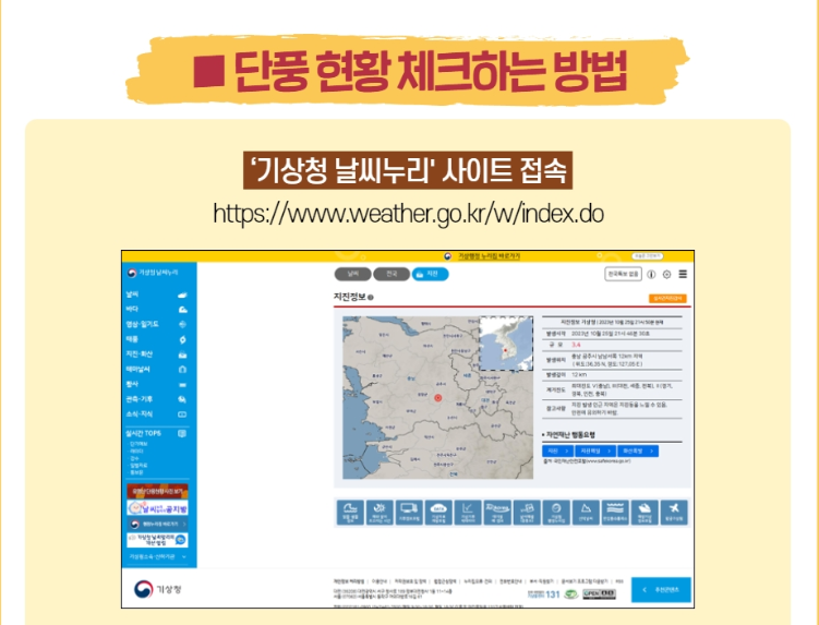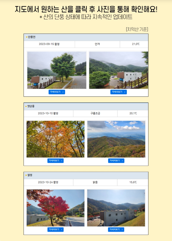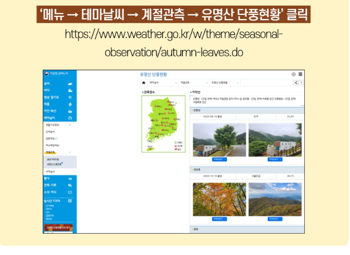 - ‘메뉴 → 테마날씨 → 계절관측 → 유명산 단풍현황’ 클릭