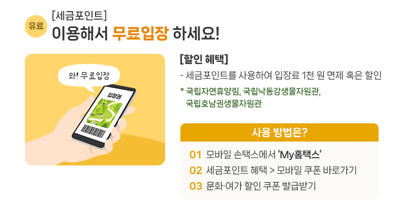 - 할인 및 면제 혜택 : 세금포인트를 사용하여 입장료 천원 면제 혹은 할인 ( 국립자연휴양림, 국립낙동강생물자원관, 국립호남권생물자원관)