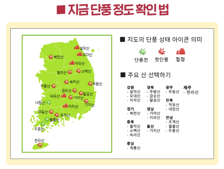 각 유명 산 별로 단풍의 절정시기와 안전하게 즐길 수 있는 단풍놀이 꿀팁 알려드립니다. 이 시기에만 경험할 수 있는 정취를 놓치지 마시기 바랍니다.