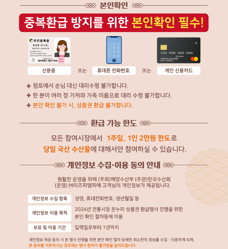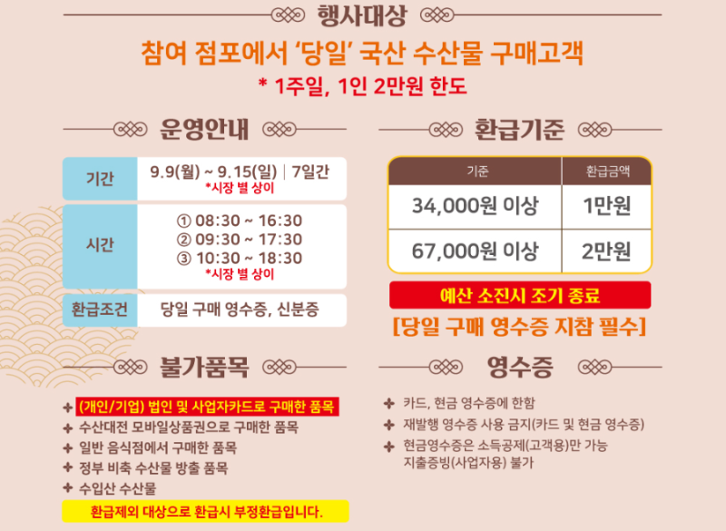 - 120개 전통 시장에서 구매영수증과 신분증 지참 후 현장에서 환급
