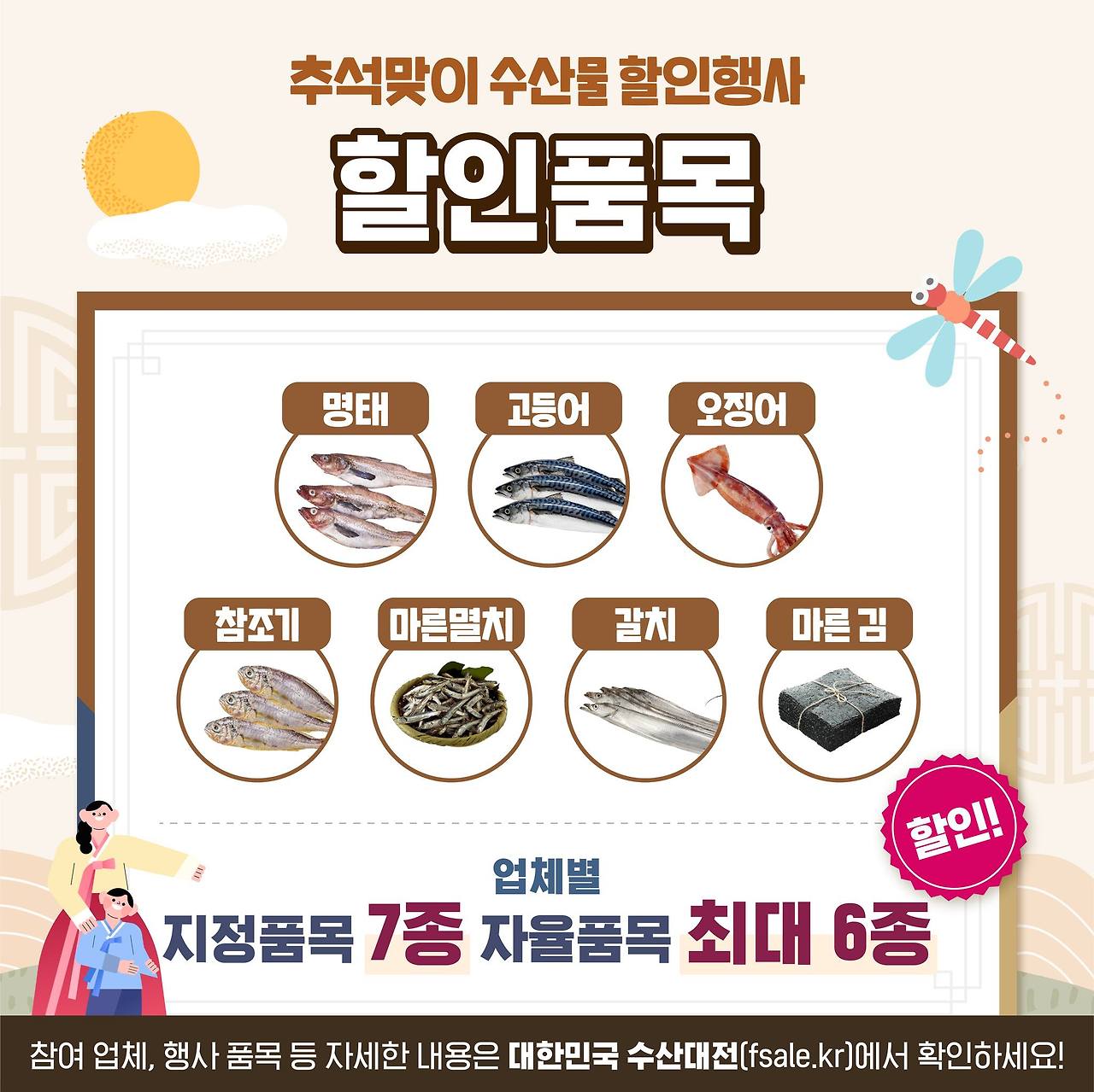 - 명태, 고등어, 오징어, 참조기, 마른멸치, 갈치, 마른 김