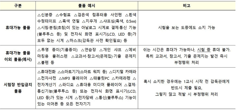 휴대전화, 스마트워치 등 스마트기기, 태블릿, 블루투스 기능있는 이어폰, 전자담배 등 모든 전자기기는 시험장에 반입할 수 없습니다. 시험장에 가지고 온 경우, 1교시 시작 전까지 감독관의 지시에 따라 제출 했다가 이후 시험종료 후에 돌려받을 수 있습니다.